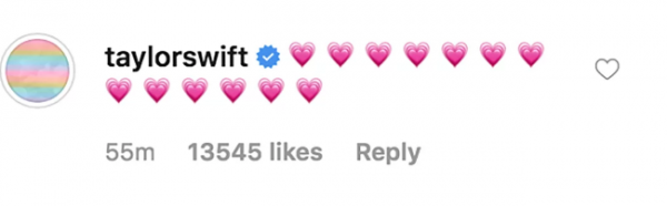 Τα λάικ, όπως ήταν επόμενο, έπεσαν βροχή και ξεπέρασαν το ένα εκατομμύριο ενώ τα σχόλια ξεπέρασαν τις 33 χιλιάδες. Η Τέιλορ Σουίφτ εξίταρε ακόμα περισσότερο το ενδιαφέρον με το αινιγματικό της σχόλιο κάτω από την φωτογραφία.