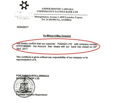 Η Pizzazz, όπως φαίνεται από έγγραφο που περιλαμβάνεται στη διαρροή των Panama Papers, απέκτησε τραπεζικό λογαριασμό στο Συνεργατικό Ταμιευτήριο Αμμοχώστου Λάρνακας υπό τον εταιρικό αριθμό ΕΤΡ01868961.