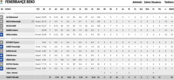 Κορυφαίοι για τους νικητές ήταν οι Μπομπουά και Λάρκιν, οι οποίο πέτυχαν από 19 πόντους, ενώ 16 έβαλε ο Μοερμάν. Αξίζει να σημειώσουμε ότι η Εφές είχε 12/26 τρίποντα σε αντίθεση με τους παίκτες της Φενέρ που ευστόχησαν μόλις σε 5 από τα 33 που σούταραν. Από τους ηττημένους ξεχώρισε ο Κάλινιτς με 17 πόντους, ενώ ο Σλούκας σε 17:13 λεπτά παιχνιδιού είχε 4 πόντους με 1/6 σουτ, 2 ριμπάουντ, μία ασίστ και 2 λάθη.