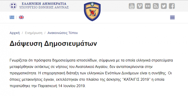 «Η επιχειρησιακή διάταξη των ελληνικών Ενόπλων Δυνάμεων είναι η συνήθης. Οι όποιες μετακινήσεις έγιναν, εκτελέστηκαν στο πλαίσιο της άσκησης ‘’ΚΑΤΑΙΓΙΣ 2019» η οποία περατώθηκε την Παρασκευή 14 Ιουνίου 2019», διευκρινίζει το υπουργείο.