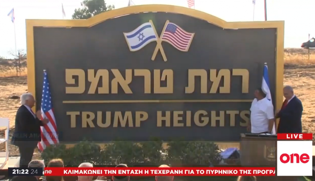 Νέο οικισμό στα Υψίπεδα του Γκολάν εγκαινίασε ο πρωθυπουργός του Ισραήλ Βενιαμίν Νετανιάχου, δίνοντας το όνομα «Υψίπεδα Τραμπ», προς τιμή του αμερικανού προέδρου.