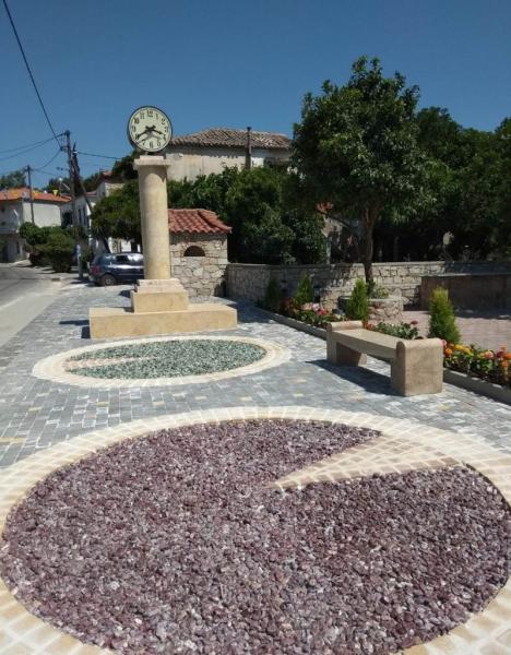 Μπροστά στο καλαίσθητο ρολόι, πάνω στο πεζοδρόμιο, τον επισκέπτη καλωσορίζουν τα σχέδια δύο ρολογιών, δημιουργημένα με βότσαλα κόκκινου και πράσινου χρώματος. Στο κόκκινο σχέδιο ο δείκτης κοιτά προς την Κύμη, ενώ στο πράσινο ο δείκτης βλέπει προς το Αλιβέρι.