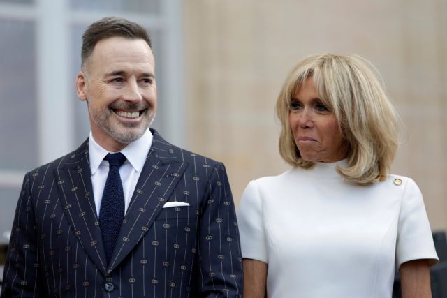 Η σύζυγος του γάλλου προέδρου Μπριζίτ Μακρόν με τον σύζυγο του Ελτον Τζον, Ντέιβιντ Φέρνις, στο προεδρικό μέγαρο (Reuters)