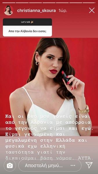 Το πανέμορφο μοντέλο, με ψυχραιμία απάντησε αποκαλύπτοντας όλες τις λεπτομέρειες που αφορούν την καταγωγή της. Επιθυμώντας να βάλει ένα τέλος στο ζήτημα έγραψε χαρακτηριστικά: «Και οι δυο μου γονείς είναι από την Αλβανία, με απόρροια το γεγονός να είμαι και εγώ. Είμαι γεννημένη και μεγαλωμένη στην Ελλάδα και φυσικά έχω ελληνική ταυτότητα γιατί την δικαιούμαι βάσει νόμου. ΑΥΤΑ».