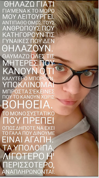 Με ανάρτηση Instagram Story στον προσωπικό της λογαριασμό στο Instagram, μίας φωτογραφίας όπου φαίνεται να θηλάζει το αγγελούδι της, αποφάσισε να βάλει τέλος στα αρνητικά σχόλια η λαμπερή ηθοποιός.