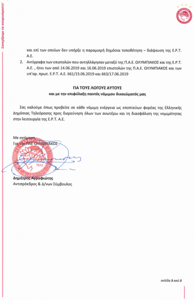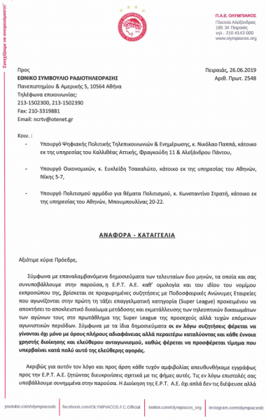 Για τους παραπάνω λόγους ο Ολυμπιακός ζήτησε άμεσα από το ΕΣΡ (δείτε σχετικά εδώ την αναφορά-καταγγελία των «ερυθρολεύκων») να ελέγξει κατά πόσο η ΕΡΤ, με τις ενέργειές της, εκπληρώνει, ως οφείλει, τις υποχρεώσεις δημόσιας υπηρεσίας που της έχουν ανατεθεί, καθώς και εάν τηρούνται οι κανόνες του δικαίου της Ευρωπαϊκής Ένωσης για τις κρατικές ενισχύσεις στη Δημόσια Ραδιοτηλεόραση!