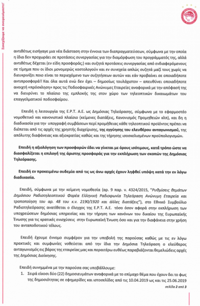 Παράλληλα οι Ερυθρόλευκοι, ζητούν να ελέγξει το ΕΣΡ εάν έχει υποβληθεί η προβλεπόμενη με βάση το άρθρο 10, παρ. 3 του Ν. 4173/2013, έκθεση για τη διαφάνεια στη χρήση του ανταποδοτικού τέλους, και εάν η έκθεση αυτή τηρεί τους κανόνες της κείμενης ελληνικής και ευρωπαϊκής νομοθεσίας, καθώς και να τους γνωστοποιήσει αντίγραφο της έκθεσης αυτής.