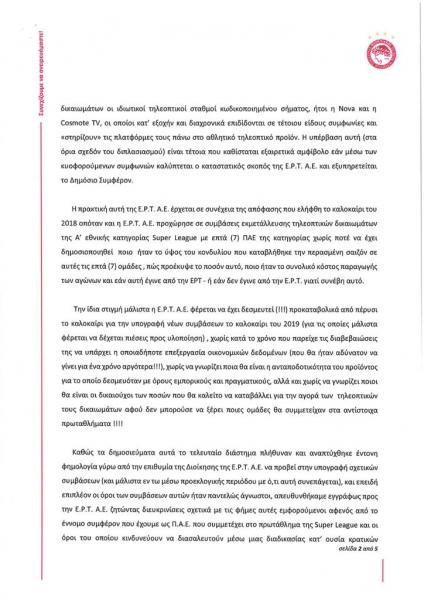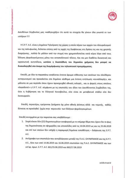 Για τους παραπάνω λόγους ο Ολυμπιακός ζήτησε άμεσα από το ΕΣΡ (δείτε σχετικά εδώ την αναφορά-καταγγελία των «ερυθρολεύκων») να ελέγξει κατά πόσο η ΕΡΤ, με τις ενέργειές της, εκπληρώνει, ως οφείλει, τις υποχρεώσεις δημόσιας υπηρεσίας που της έχουν ανατεθεί, καθώς και εάν τηρούνται οι κανόνες του δικαίου της Ευρωπαϊκής Ένωσης για τις κρατικές ενισχύσεις στη Δημόσια Ραδιοτηλεόραση!