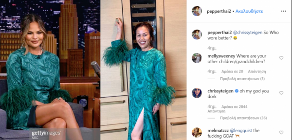 Στην λεζάντα έγραψε χιουμοριστικά: «Ποια το φόρεσε καλύτερα;» Η Κρίστι Τάιγκεν δεν δίστασε να σχολιάσει: «Ω θεε μου! Είσαι χαζούλα!».
