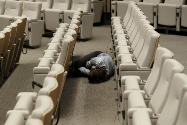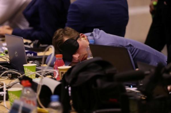 Το ξενύχτι, λοιπόν, βρήκε κάποιους δημοσιογράφους να κοιμούνται όπου βρουν… άλλοι στο πάτωμα, άλλοι έχοντας κάνει το γραφείο τους κρεβάτι και άλλοι με το laptops τους για… μαξιλάρι.