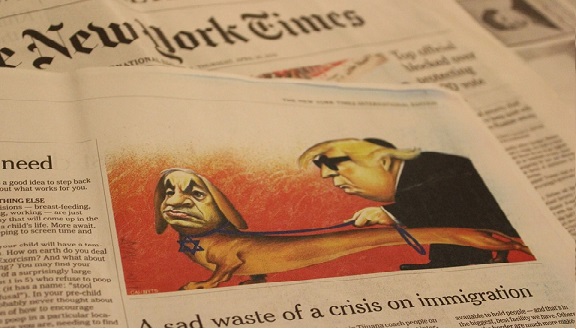 Ηταν στα μέσα του περασμένου Απριλίου όταν στους New York Times δημοσιεύθηκε ένα σκίτσο στο οποίο εικονιζόταν ένας τυφλός Ντόναλντ Τραμπ να οδηγείται από έναν σκύλο που είχε τη μορφή του Μπενιαμίν Νετανιάχου. Από το κολάρο του σκύλου κρεμόταν ένα άστρο του Δαβίδ. Και μάλλον αυτό ήταν αρκετό για να θεωρηθεί το σχόλιο του σκιτσογράφου περισσότερο αντισημιτικό παρά δεικτικό.