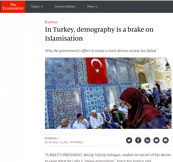 Ο Τούρκος Πρόεδρος Ρετζέπ Ταγίπ Ερντογάν δεν κρύβει την επιθυμία του να διαμορφώσει μια «ευλαβή γενιά», γράφει το βρετανικό περιοδικό Economist, τονίζοντας όμως ότι ο μεγαλύτερος ανασταλτικός παράγοντας στο πολιτικό Ισλάμ για αναδιαμόρφωση της τουρκικής κοινωνίας είναι το δημογραφικό.