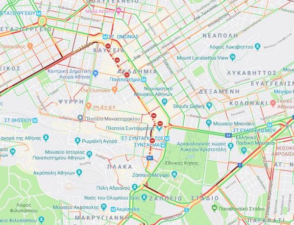 Συγκεκριμένα έχει διακοπεί η κυκλοφορία των οχημάτων στη Σταδίου και στη Φιλλελήνων ενώ δόθηκε και πάλι στην κυκλοφορία η λεωφόρος Αμαλίας που είχε κλείσει νωρίτερα.