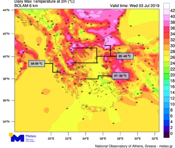 Οι θερμές αέριες μάζες, οι οποίες απασχόλησαν τη Δυτική Ευρώπη μετακινούνται ανατολικά και θα επηρεάσουν βαθμιαία την Ανατολική Ευρώπη και τη χώρα μας, με πολύ υψηλές θερμοκρασίες από την Τετάρτη 03/07 έως την Παρασκευή 05/07/2019.