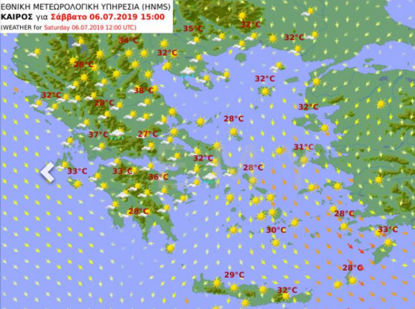 Το Σάββατο 6 Ιουλίου 2019 αναμένονται τοπικές νεφώσεις αρχικά στην Ανατολική Θεσσαλία και την Ανατολική Στερεά Ελλάδα και από το μεσημέρι και στα υπόλοιπα ηπειρωτικά. Τοπικές βροχές και ενδεχομένως καταιγίδες θα σημειωθούν από το μεσημέρι κι έπειτα κατά κύριο λόγο στα ορεινά, τα δυτικά ηπειρωτικά και την Πελοπόννησο.Η θερμοκρασία στη Δυτική Μακεδονία θα κυμανθεί από 16 έως 31 βαθμούς, στην υπόλοιπη Μακεδονία από 21 έως 36, στη Θεσσαλία και την Ανατολική Στερεά από 22 έως 37, στα υπόλοιπα ηπειρωτικά από 21 έως 36, στα νησιά του Ιονίου από 24 έως 31, στα νησιά του Ανατολικού Αιγαίου από 22 έως 34 και στα νησιά του υπολοίπου Αιγαίου και την Κρήτη από 22 έως 32.