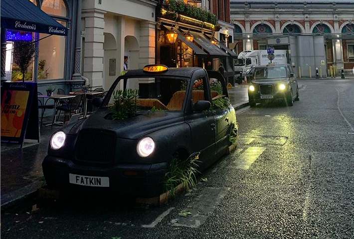 Το παροπλισμένο μαύρο ταξί έχει μετατραπεί σε ένα παιχνιδιάρικο δημόσιο χώρο, στολισμένο με λουλούδια, όπου μπορεί κανείς να καθίσει για να χαλαρώσει.