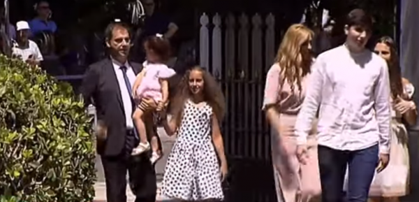 Συνοδευόμενος από τη σύζυγό του Δήμητρα και τα 4 παιδιά τους κατευθύνθηκαν πιασμένοι χέρι χέρι προς το εσωτερικό του Μεγάρου. Ο κ. Θεοχάρης κρατούσε στην αγκαλιά του το νεότερο μέλος της οικογένειας, τη μικρή Γεωργία η οποία είναι μόλις τριών ετών.