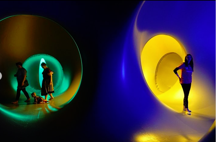 Φως πλημμυρίζει τα τούνελ του λαβυρίνθου, περνώντας μέσα από χρωματιστά πάνελ από διαφανές υλικό και λούζοντας το εσωτερικό με φωτεινές και αιθέριες αποχρώσεις