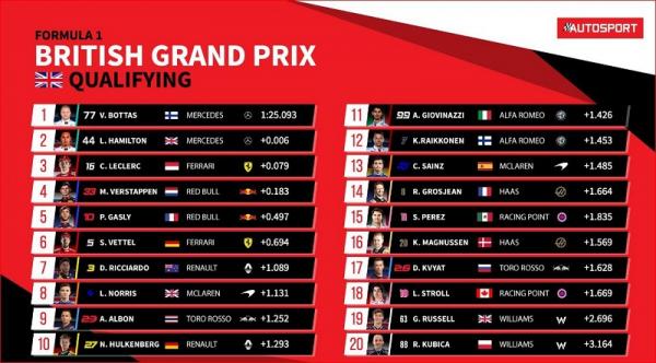 Ο Φινλανδός Βάλτερι Μπότας κατάφερε να πάρει την pole position στην πίστα του Σιλβερστόουν προς απογοήτευση των Βρετανών οπαδών που ήθελαν τον συμπατριώτη τους Λιούις Χάμιλτον