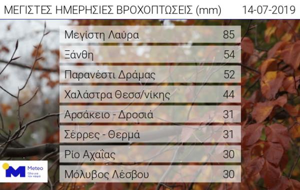 Οι εντονότερες βροχοπτώσεις καταγράφηκαν στην Μεγίστη Λαύρα, στην χερσόνησο του Άθω, όπου έως τις 20:00 το βράδυ είχαν μετρηθεί 85 χιλιοστά νερού. Στην Ξάνθη το ύψος έφτασε τα 54 χιλιοστά.