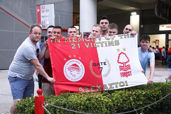 Μια σπουδαία πράξη από τους βρετανούς φιλάθλους, οι οποίοι κατέθεσαν στεφάνι στη μνήμη των θυμάτων, ενώ παράλληλα κρατούσαν στα χέρια τους ένα πανό το οποίο έγραφε: «Στη μνήμη των 21 θυμάτων. Αξέχαστοι». Τους οπαδούς της Νότιτγχαμ υποδέχθηκε αντιπροσωπεία των οργανωμένων οπαδών του Ολυμπιακού, αλλά και ο γ’ αντιπρόεδρος της πειραϊκής ΠΑΕ, Κώστας Καραπαπάς.