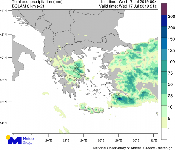 Όσον αφορά την εξέλιξη της κακοκαιρίας, κατά το υπόλοιπο της Τετάρτης 17/07 αναμένονται βροχές και σποραδικές καταιγίδες με σταδιακή εξασθένηση στην Ανατολική Στερεά, Θεσσαλία και Πελοπόννησο, τα ορεινά κεντρικά και νότια ηπειρωτικά, τις Σποράδες, την Εύβοια, την Κρήτη και τα Δωδεκάνησα. Στον χάρτη που ακολουθεί παρουσιάζεται ο ολικός υετός που αναμένεται την Τετάρτη 17/07.
