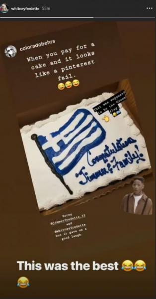 Και αυτό γιατί η σύζυγος του, Ουίτνι Φριντέτ «ανέβασε» στις InstaStories της μια φωτογραφία με μια τούρτα που είχε πάνω την ελληνική σημαία και στην οποία έγραφε «Συγχαρητήρια στον Τζίμερ και στην οικογένειά του!»