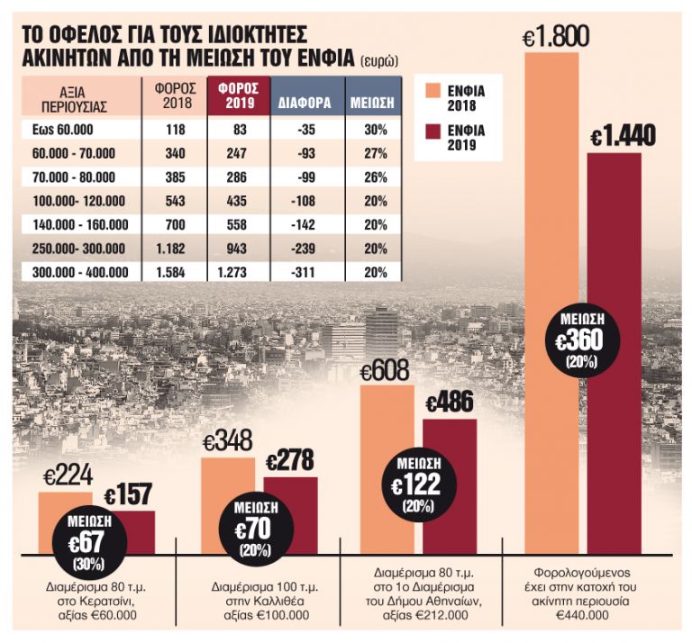 Χαρακτηριστικά παραδείγματα: Για ένα διαμέρισμα αντικειμενικής αξίας 60.000 ευρώ στον Κορυδαλλό σήμερα ο ιδιοκτήτες πληρώνει ΕΝΦΙΑ σήμερα 224 ευρώ. Το 2019 θα πληρώσει 156 ευρώ, δηλαδή θα έχει μείωση 30% που αντιστοιχεί σε 67 ευρώ.