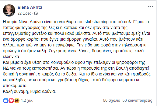 «Η κυρία Νόνη Δούνια είναι το νέο θύμα του slut shaming στα σόσιαλ. Γέμισε ο τόπος φωτογραφίες της λες κι η κοπέλα και δεν ήταν στα νιάτα της επαγγελματίας μοντέλο και πολύ καλό μάλιστα. Αυτό που βλέπουμε εμείς είναι ένα όμορφο κορίτσι που έγινε μια όμορφη γυναίκα. Αυτό που βλέπουν κάτι άλλοι…προτιμώ να μην το περιγράψω. Την είδα μια φορά στην τηλεόραση κι ομολογώ ότι ήταν καλή. Συγκροτημένος λόγος, δομημένες προτάσεις, καλά ελληνικά.