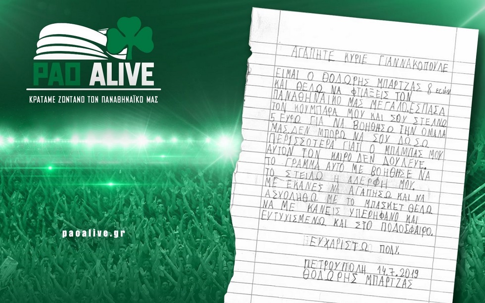 Συγκλονίζει νεαρός φίλος του Παναθηναϊκού! Ο 8χρονος Θοδωρής Μπαρτζάς από την Πετρούπολη, έστειλε ένα ιδιαίτερα συγκινητικό γράμμα στον Δημήτρη Γιαννακόπουλο, δηλώνοντας τη στήριξή του στο εγχείρημα του μεγαλομετόχου της ΚΑΕ Παναθηναϊκός, το Pao Alive