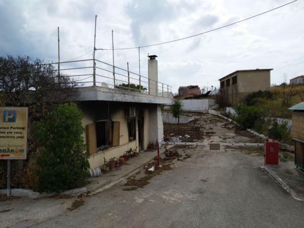 Το άλλοτε πολυσύχναστο κάμπινγκ είναι ένα μέρος-φάντασμα. Κλειστή με λουκέτο η κεντρική συρόμενη καγκελόπορτα, και στο εσωτερικό η σχεδόν απόκοσμη εικόνα του κτιρίου της διεύθυνσης, το ποίο φέρει ακόμα τα σημάδια της πυρκαγιάς, σαν να σταμάτησε ο χρόνος ξαφνικά.