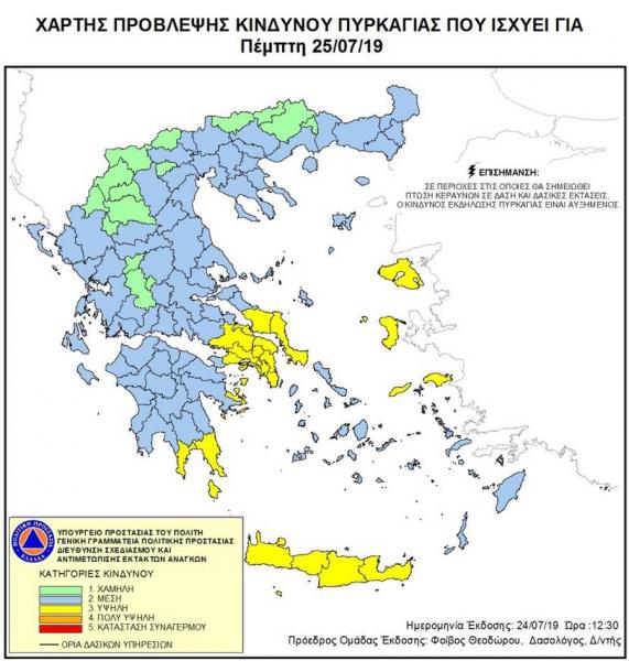 Υψηλός κίνδυνος πυρκαγιάς προβλέπεται στις περιοχές της Αττικής, Βοιωτίας, Εύβοιας, Λέσβου, Χίου, Σάμου, Ικαρίας, Κρήτης, Κυθήρων και Λακωνίας.