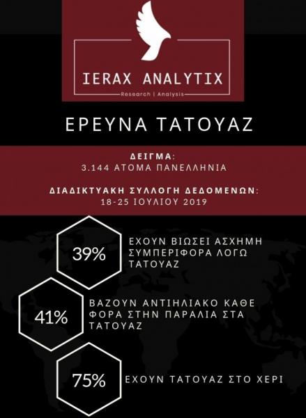 Μπορεί οι άνθρωποι που έχουν κάποιο τατουάζ να αυξάνονται συνεχώς, όμως ακόμα υπάρχει εκφρασμένη προκατάληψη προς αυτούς, σύμφωνα με τα ευρήματα της νέας, πανελλαδικής έρευνας που διεξήγαγε (από τις 18 μέχρι τις 25 Ιουλίου) η εταιρεία ερευνών και αναλύσεων της ierax analytix σε 3.144 άτομα (άνδρες και γυναίκες 17 έως 45 ετών) σχετικά με τα τατουάζ, την προστασία στον ήλιο και την προκατάληψη που υπάρχει ακόμα.