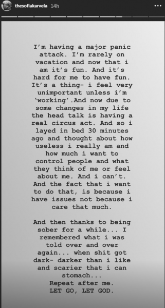 «Αυτή τη στιγμή έχω πάθει κρίση πανικού. Σπανίως βρίσκομαι σε διακοπές και θα έπρεπε να διασκεδάζω. Αλλά είναι δύσκολο για μένα να διασκεδάσω. Το θέμα είναι πως νιώθω τελείως ασήμαντη όσο δεν δουλεύω. Ξάπλωσα στο κρεβάτι πριν μισή ώρα και σκέφτηκα πόσο άχρηστη πράγματι είμαι και πόσο θέλω να χειρίζομαι τους ανθρώπους και οτιδήποτε σκέφτονται ή νιώθουν για εμένα. Και δε μπορώ. Και η αλήθεια είναι πως θέλω να το κάνω αυτό επειδή έχω προβλήματα και όχι επειδή με ενδιαφέρει τόσο πολύ. Και μετά, χάρη στο ότι είμαι νηφάλια για λίγο, θυμήθηκα τι μου λένε και μου ξαναλένε να κάνω όταν τα πράγματα ‘’παίρνουν την κάτω βόλτα’’. Επαναλάβετε μετά από μένα: Άστο να περάσει, άστο να περάσει».
