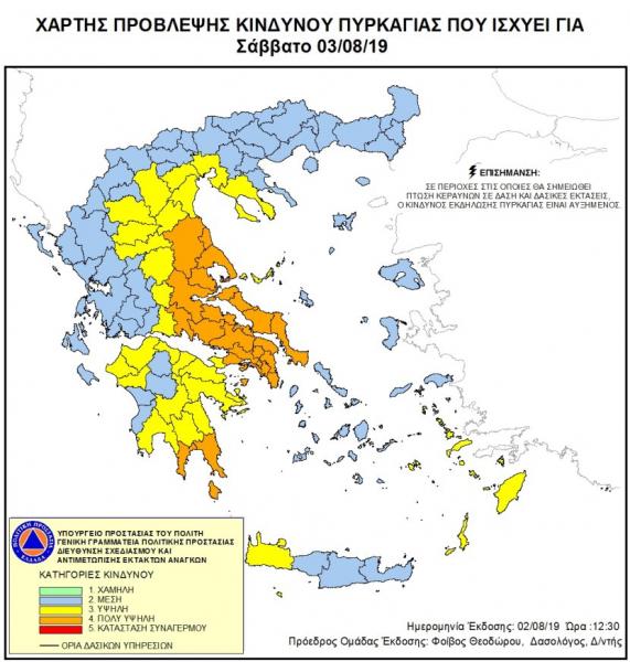 Πολύ υψηλός κίνδυνος πυρκαγιάς προβλέπεται για αύριο Σάββατος 3 Αυγούστου, σύμφωνα με το Χάρτη Πρόβλεψης Κινδύνου Πυρκαγιάς που εκδίδει η Γενική Γραμματεία Πολιτικής Προστασίας του Υπουργείου Προστασίας του Πολίτη σε αρκετές περιοχές της χώρας.