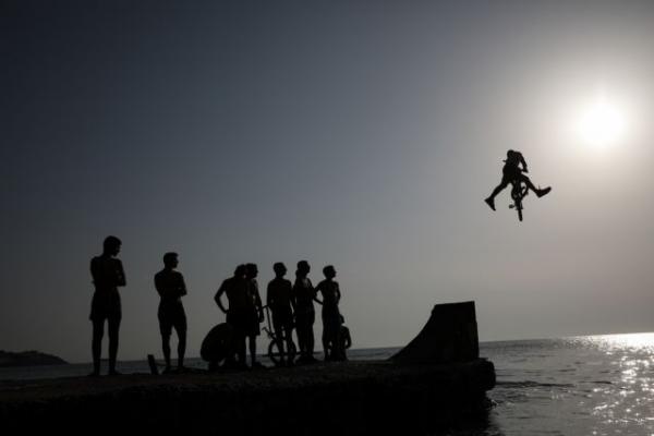 Η πρόκληση ήταν άκρως… καλοκαιρινή, καθώς οι ποδηλάτες έκαναν την φιγούρες τους και στην συνέχεια απολάμβαναν μία βουτιά στην θάλασσα.