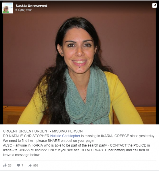 «Η αδελφή μου Νάταλι Κρίστοφερ αγνοείται από χθες στην Ικαρία της Ελλαδας. Αν έχετε τον αριθμό της, σας παρακαλώ μην την καλείτε. Αυτό θα εξαντλήσει την μπαταρία και η αστυνομία προσπαθεί να βρει τη θέση της με το κινητό της» γράφει χαρακτηριστικά στην ανάρτησή της.