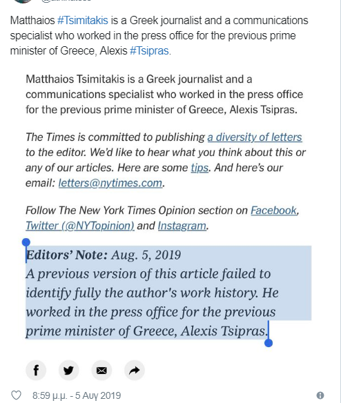 Οι New York Times μετά τις σχετικές αντιδράσεις στο τέλος του κειμένου, διευκρίνισαν στο τέλος του κειμένου του κ. Τσιμιτάκη ότι δεν είχε εξακριβώσει πλήρως το εργασιακό παρελθόν του συντάκτη, προτού δημοσιεύσει το άρθρο, γνωστοποιώντας ότι εργαζόταν στο Γραφείο Τύπου του Αλέξη Τσίπρα. «A previous version of this article failed to identify fully the author’s work history. He worked in the press office for the previous prime minister of Greece, Alexis Tsipras», αναφέρεται στο τέλος του άρθρου.
