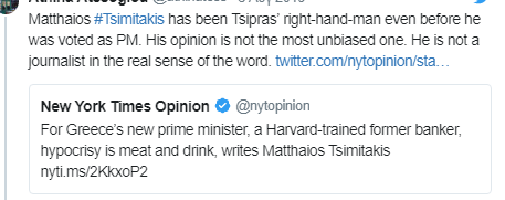 Ωστόσο, οι New York Times αρχικά, δεν παρέθεσαν στις πληροφορίες σχετικά με τον συντάκτη του κειμένου, ότι αυτός εργαζόταν στο Γραφείο Τύπου του πρώην πρωθυπουργού Αλέξη Τσίπρα.