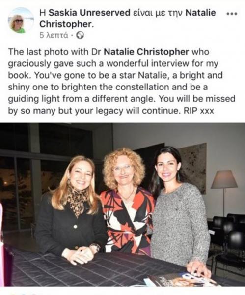 «Η απώλειά της Νάταλι Κρίστοφερ θα γίνει ιδιαίτερα αισθητή εδώ στην Κύπρο όπου ενέπνευσε πολλούς ανθρώπους», ανέφερε σε ανάρτησή της στο Twitter η Αμερικανίδα Πρέσβειρα στο νησί Τζούντιθ Γκάρμπερ.