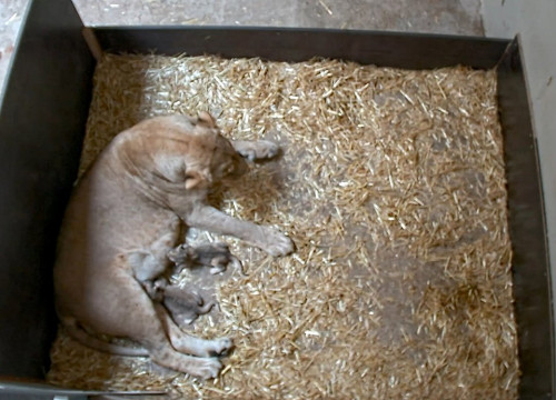 Σύμφωνα με την εκπρόσωπο τύπου, η λέαινα ήταν πολύ τρυφερή με τα νεογέννητα λιονταράκια όταν γέννησε.