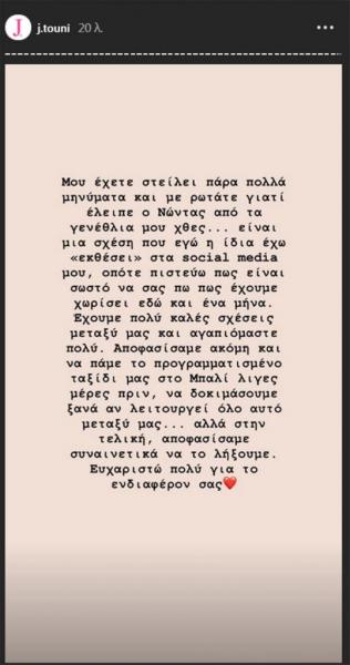 «Μου έχετε στείλει πάρα πολλά μηνύματα και με ρωτάτε γιατί έλειπε ο Νώντας από τα γενέθλια μου χθες. Είναι μια σχέση που εγώ η ίδια έχω εκθέσει στα social media μου, οπότε πιστεύω πως είναι σωστό να σας πως έχουμε χωρίσει εδώ και ένα μήνα. Έχουμε πολύ καλές σχέσεις μεταξύ μας και αγαπιόμαστε πολύ.