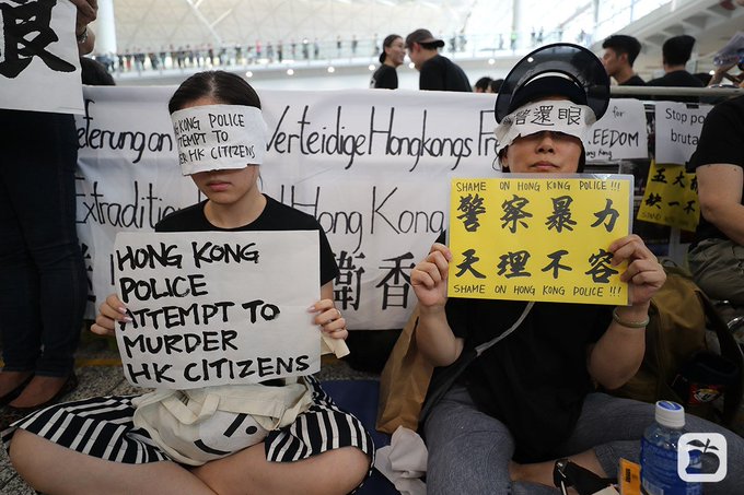 New slogan post #Aug11 at airport #antiELAB rally – “Black cops, return the eye.” #hongkongprotests #hongkong #hk pic.twitter.com/Y0aTxILoh4