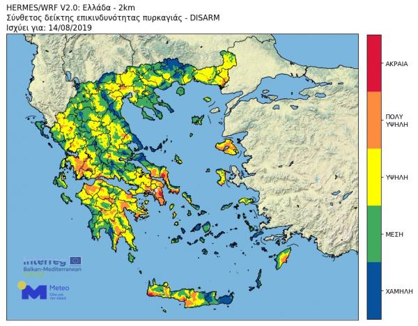 Στον παρακάτω χάρτη παρουσιάζεται ο σύνθετος δείκτης επικινδυνότητας πυρκαγιάς για τις μεσημεριανές της Τετάρτης 14/08. Με πορτοκαλί και κόκκινα χρώματα φαίνονται οι περιοχές με πολύ υψηλή και ακραία επικινδυνότητα.