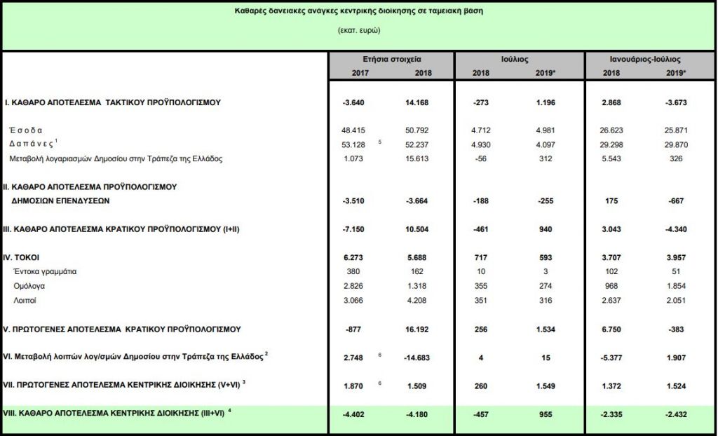 Το καθαρό ταμειακό αποτέλεσμα της κεντρικής διοίκησης παρουσίασε έλλειμμα 2.432 εκατ. ευρώ την περίοδο Ιανουαρίου-Ιουλίου 2019, έναντι ελλείμματος 2.335 εκατ. ευρώ την αντίστοιχη περίοδο του 2018, σύμφωνα με στοιχεία της Τράπεζας της Ελλάδος.