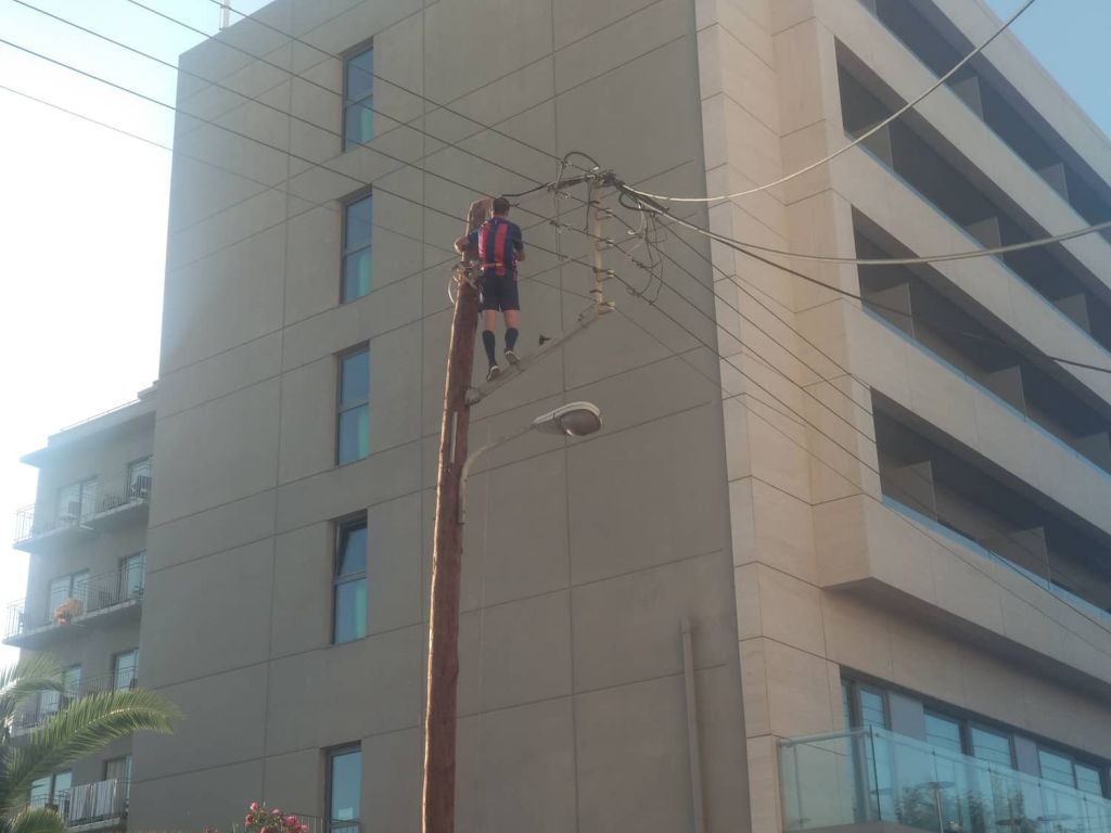 Ένας άνδρας, φορώντας αθλητικά – ποδοσφαιρικά ρούχα, ξεκίνησε να σκαρφαλώνει – χωρίς κανέναν λόγο και χωρίς τη λήψη κάποιου μέτρου προστασίας – σ ‘ έναν από τους στύλους της ΔΕΗ.