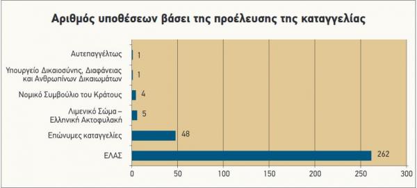 Σαράντα οκτώ (48) από αυτές αφορούσαν επώνυμες καταγγελίες, ιδιωτών ή ενώσεων, ενώ διακόσιες εξήντα δύο (262) υποβλήθηκαν στον Μηχανισμό από την ΕΛΑΣ και πέντε (5) από το ΛΣ – ΕΛΑΚΤ.