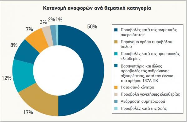 Από τις υποθέσεις που εξέτασε ο Μηχανισμός, 25 αφορούν βασανιστήρια και άλλες προσβολές της ανθρώπινης αξιοπρέπειας, κατά την έννοια του άρθρου 137Α ΠΚ, 49 παράνομη χρήση όπλου, 10 προσβολή της γενετήσιας ελευθερίας, 3 αφορούν προσβολές κατά της ζωής, 37 προσβολές κατά της προσωπικής ελευθερίας, 145 προσβολές κατά της σωματικής ακεραιότητας, 7 ανάρμοστη συμπεριφορά, ενώ σε 21 περιπτώσεις διερευνήθηκε η ύπαρξη ρατσιστικού κινήτρου.