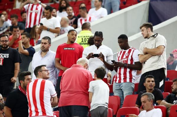 Εκτός από τον Χαραλαμπόπουλο, στο γήπεδο βρίσκονται κι άλλοι παίκτες του τμήματος μπάσκετ, όπως ο Όγκουστιν Ρούμπιτ, ο Μπράντον Πολ, ο Ίθαν Χαπ, και ο Γουίλ Τσέρι. Ο τελευταίος κιόλας φοράει και ποδοσφαιρική φανέλα των ερυθρόλευκων.