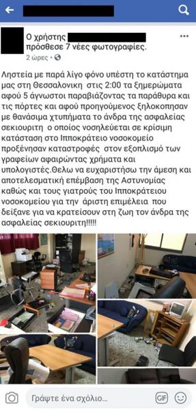 Αναλυτικά η ανάρτηση: «Ληστεία με παρά λίγο φόνο υπέστη το κατάστημα μας στη Θεσσαλονίκη στις 2:00 τα ξημερώματα αφού 5 άγνωστοι παραβιάζοντας τα παράθυρα και τις πόρτες και αφού προηγουμένως θανάσιμα χτυπήματα το άνδρα της ασφαλείας σεκιούριτι ο οποίος νοσηλεύεται σε κρίσιμη κατάσταση στο Ιπποκράτειο νοσοκομείο προξένησαν καταστροφές στον εξοπλισμό των γραφείων αφαιρώντας χρήματα και υπολογιστές. Θέλω να ευχαριστήσω την άμεση και αποτελεσματική επέμβαση της Αστυνομίας καθώς και τους γιατρούς του Ιπποκράτειου νοσοκομείου για την άριστη επιμέλεια που δείξανε για να κρατήσουν στη ζωή τον άνδρα της ασφαλείας σεκιούριτι!!!!!»